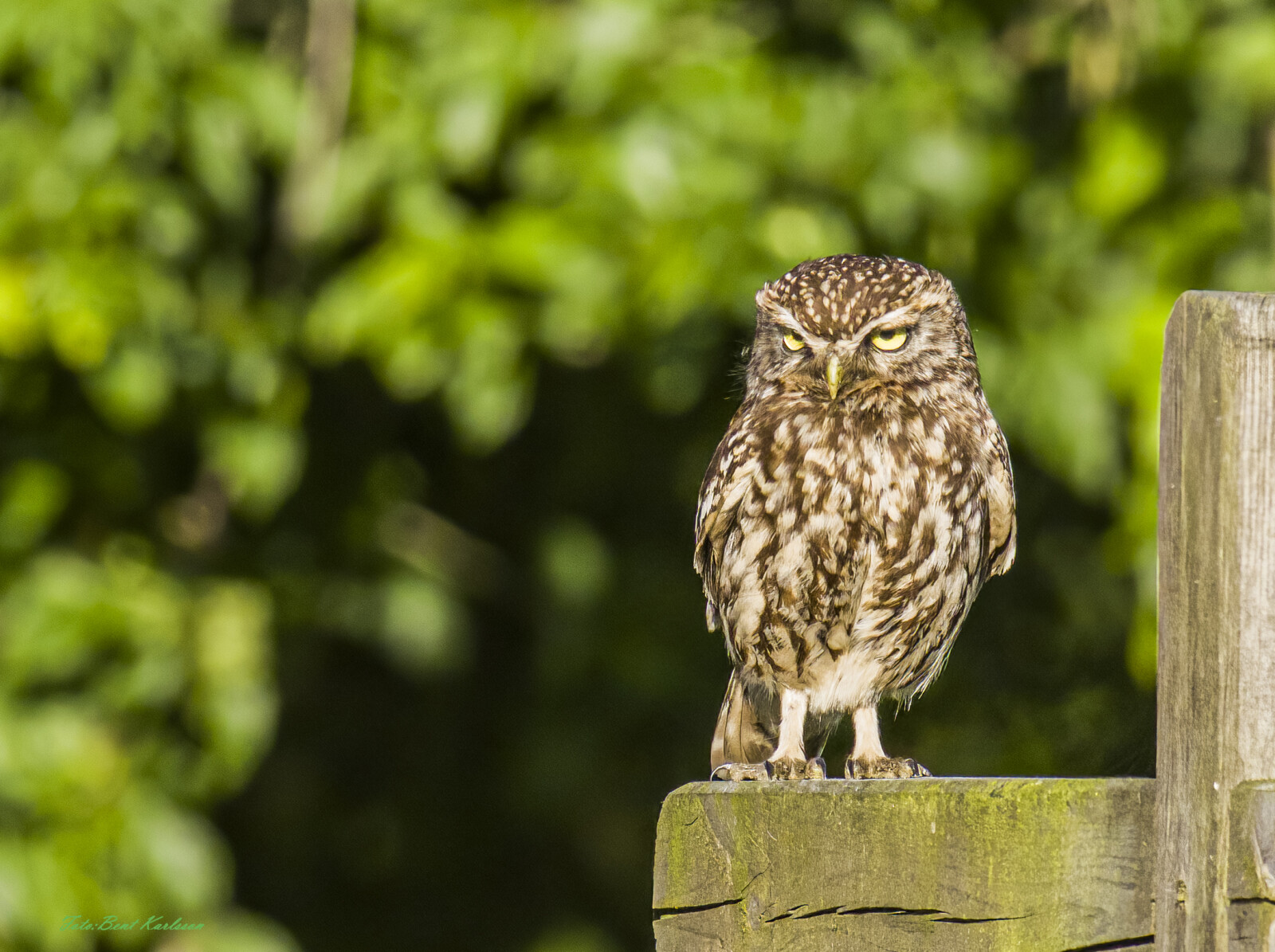 # kirkeugle på tørrestativ ser lige mod solen og fotografen.