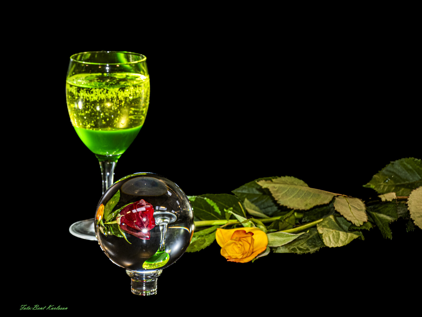 #vinglas#grøn#rose#rød#gul#studiebillede#stilleben