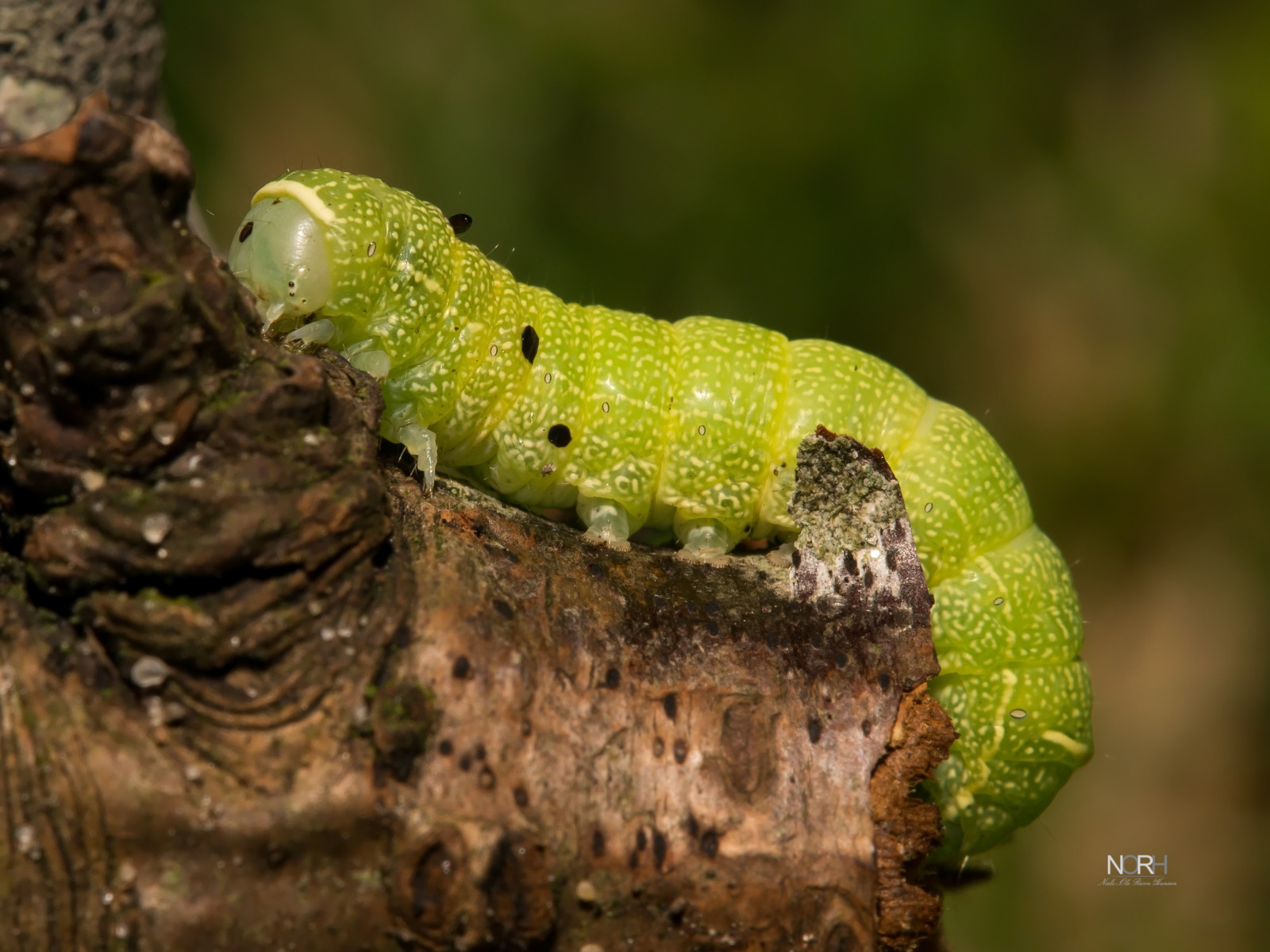 Larven her er en lille grøn sag på ca. 20 mm. Den er med til at formidle sommerens glæder, idet den forpupper sig og bliver til en smuk sommerfugl, der gøre vores prydhaver og vilde enge endnu smukkere end de i forvejen er. :-) God sommer.
