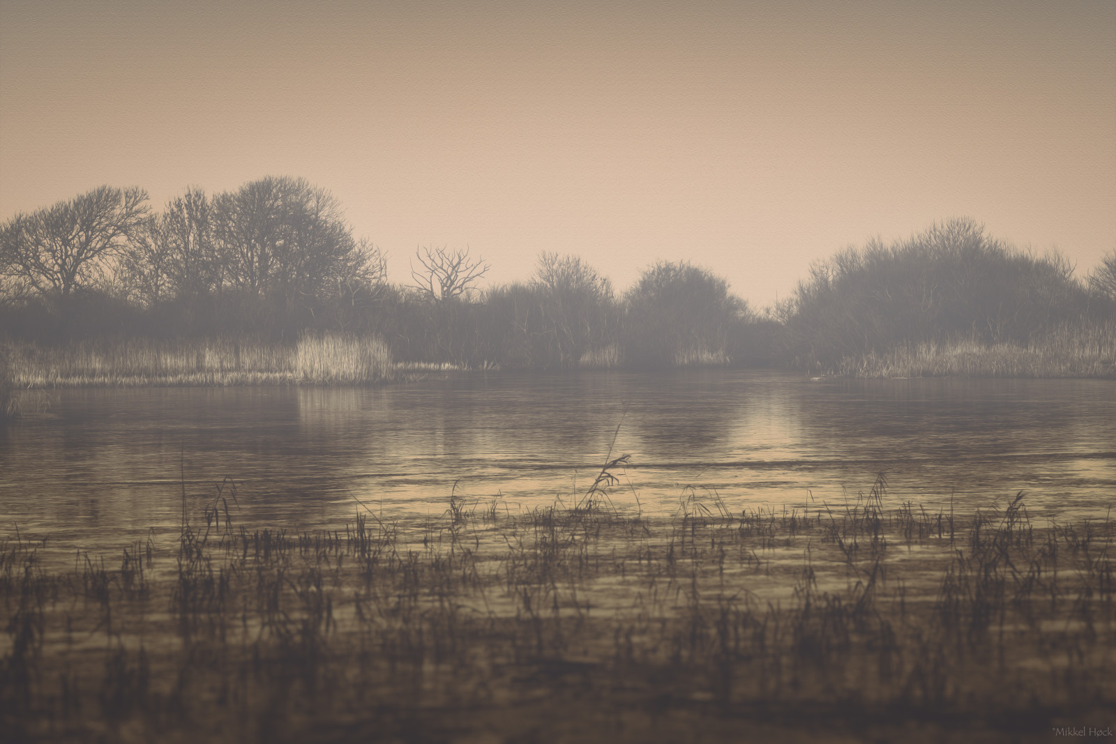Ville have haft fugle på himlen med refleksionen i vandet, men ingen i sigte.