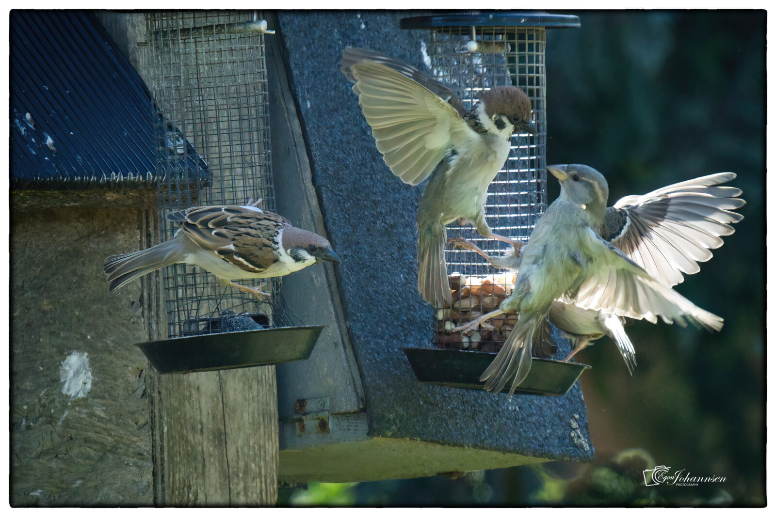 Kampen ved foderbrættet. Taget i haven i Genner.