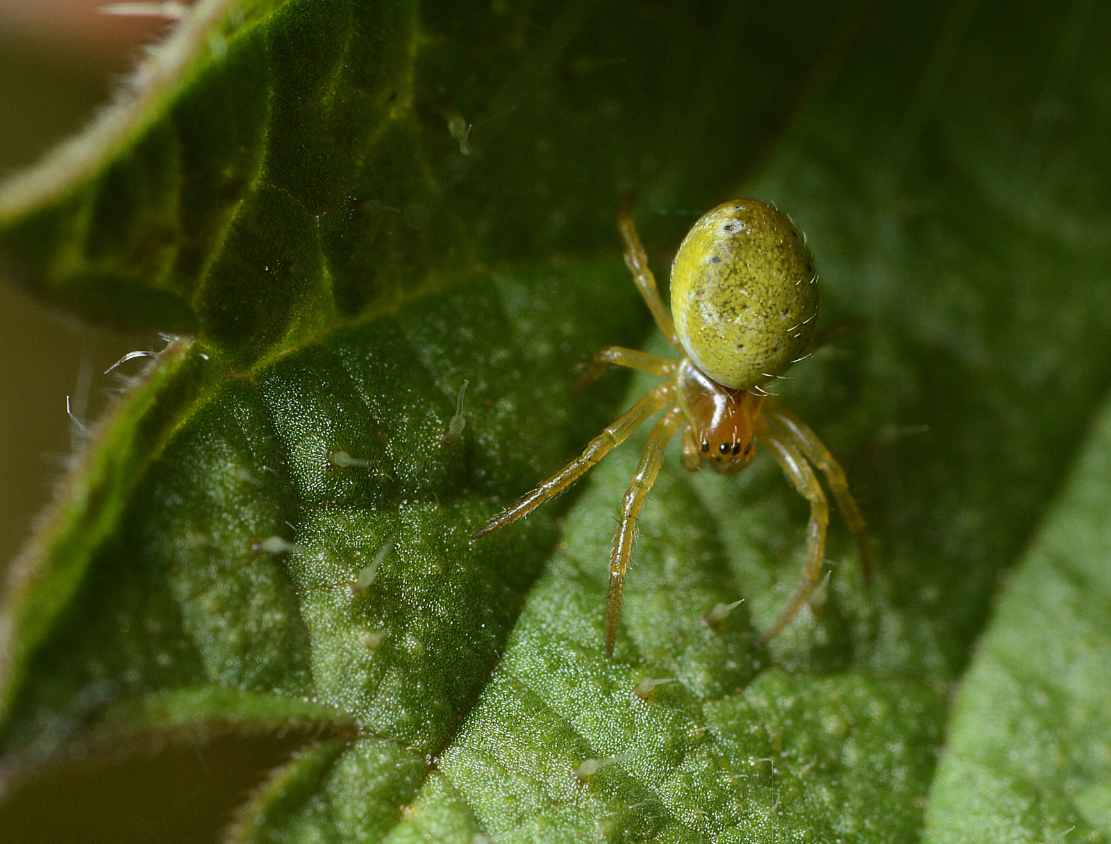Den lille grønne fætter sidder på et brændnælleblad kunne måske være lidt skarpere ved øjnene men se også de hvide næller på bladet' det giver lidt mening om hvor stor ederkoppen er. #edderkop #macro #grøn #brændnælle '
